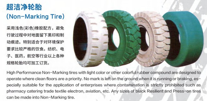 超潔凈環(huán)保實(shí)心輪胎采用超細(xì)環(huán)保材料制成,避免行駛過程中對(duì)地面留下黑印和制動(dòng)痕跡,特別適合于對(duì)環(huán)境保護(hù)要求比較嚴(yán)格的飲食、紡織、電子、醫(yī)藥、航空等行業(yè)。
